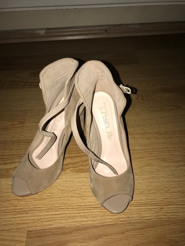 Bej süet stiletto topuklu tokalı ayakkabılar, minimalist ve çağdaş tasarıma sahip, romantik akşam buluşmaları için uygun. Düz ve desensiz yüzeye sahiptir.