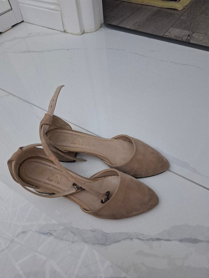Bej süet malzemeden, tokalı ve sivri burunlu stiletto topuklu kadın ayakkabısı, minimalist ve çağdaş tasarıma sahiptir.