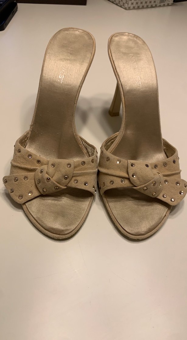 Bej süet kadın abiye ayakkabı, stiletto topuklu, tokalı ve nakış detaylı, romantik buluşmalar için uygundur.