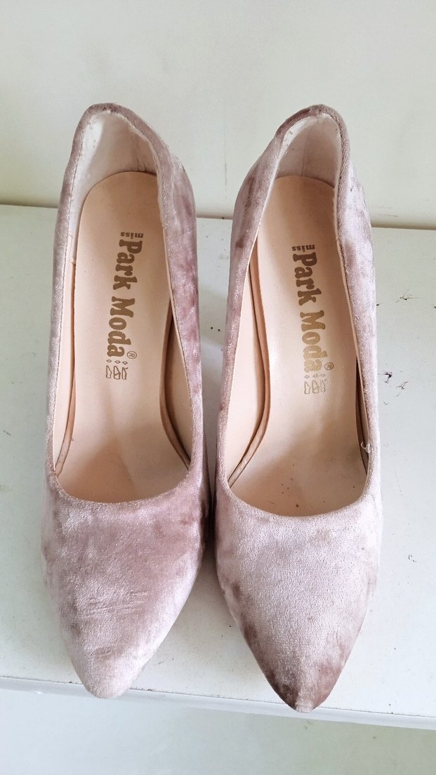Bej süet malzemeden yapılmış, pastel tonlarda, sivri burunlu ve bohem tarzda stiletto topuklu kadın ayakkabısı. Marka: Park Moda.