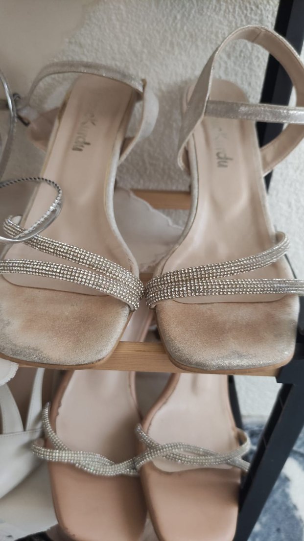 Bej süet malzemeden, stiletto topuklu ve tokalı bantlara sahip kadın ayakkabısı. Paris tarzı, desen içermeyen klasik ve şık tasarım.