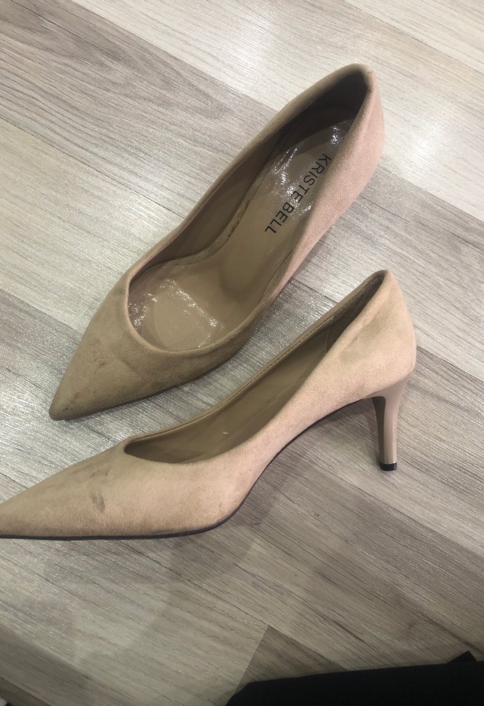 Bej süet malzemeden yapılmış, sivri burunlu ve orta yükseklikte topuklu stiletto, modern klasik tarzı ve zahmetsiz şıklığı ofis için sunar.