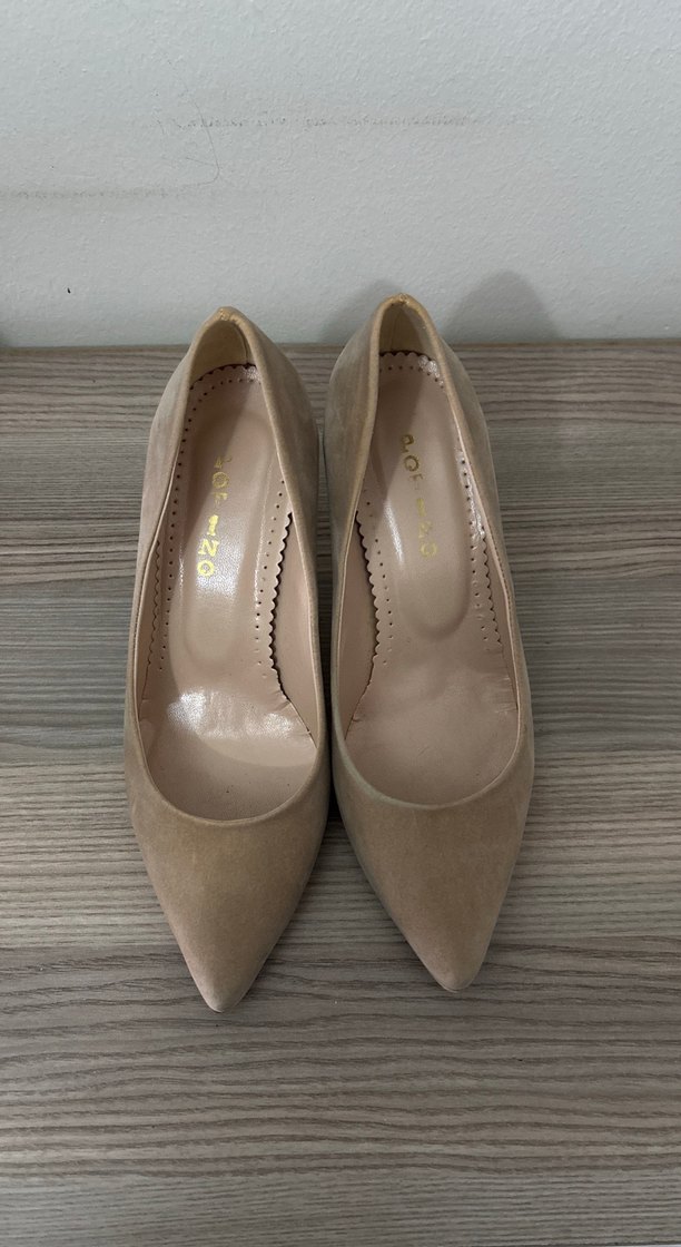 Bej süet stiletto topuklu ayakkabılar, sivri burunlu ve sade tasarımlıdır. Modern klasik stile uygun, ofis için ideal, zahmetsiz şıklık sunar.