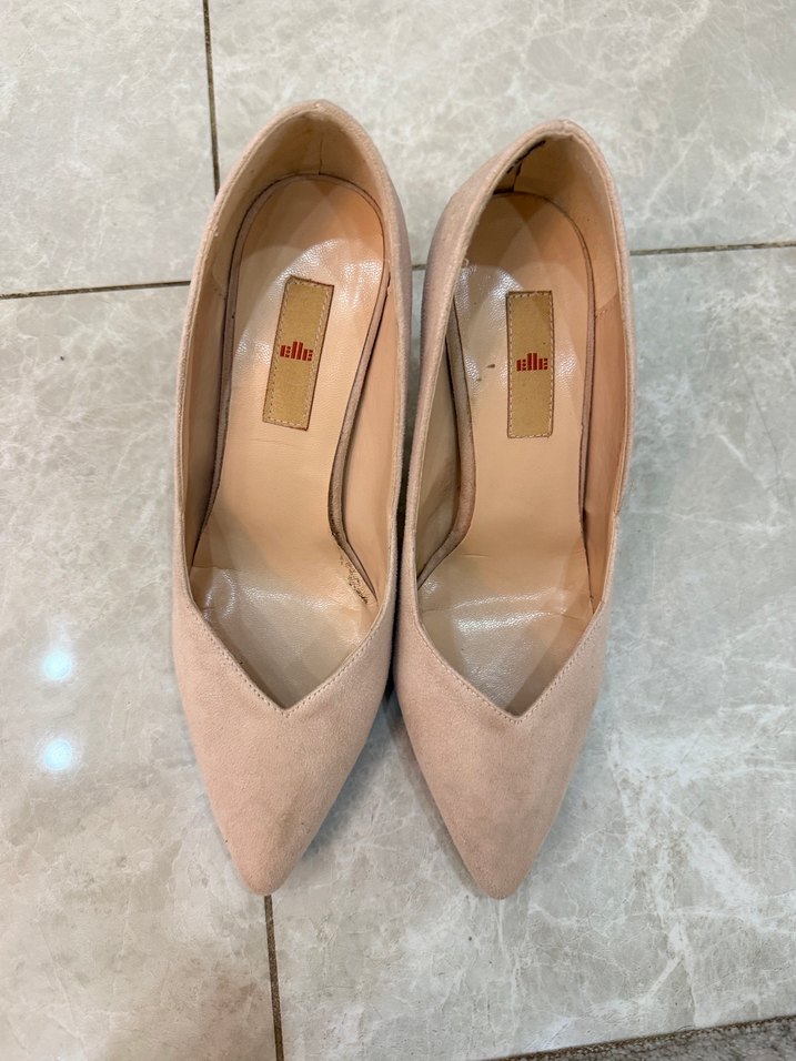Bej süet malzemeden yapılmış, sivri burunlu stiletto topuklu ayakkabılar. Ofis için uygun, minimal ve klasik şıklığı yansıtan pastel tonlarda.