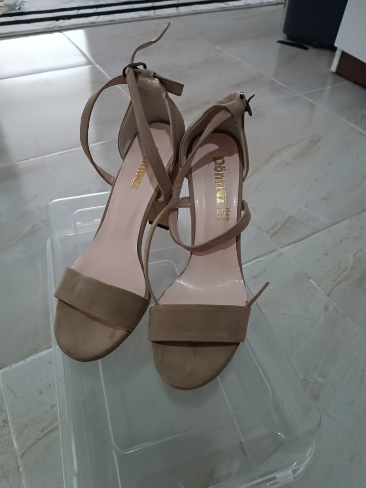 Bej süet malzemeden yapılmış, stiletto topuklu, tokalı ve minimalist tarzda kadın ayakkabısı, günlük kullanıma uygun.