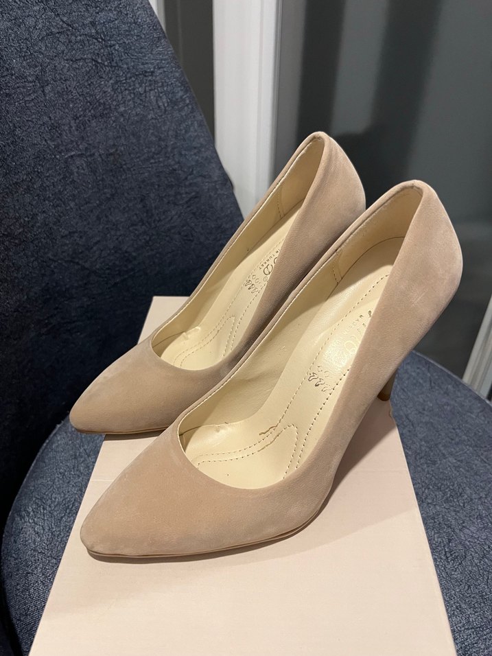 Bej süet stiletto topuklu, modern klasik tasarıma sahip, ofis için zahmetsiz şıklık sunan kadın ayakkabısı. Desensiz yüzeyi zamansız şıklık katıyor.