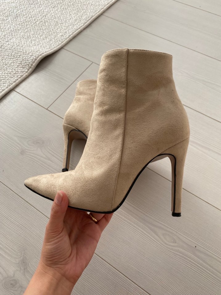 Bej süet malzemeden stiletto topuklu kadın botlar, günlük kullanıma uygun çağdaş ve zahmetsiz şıklık sunar. Trendy casual tarzlar için ideal.