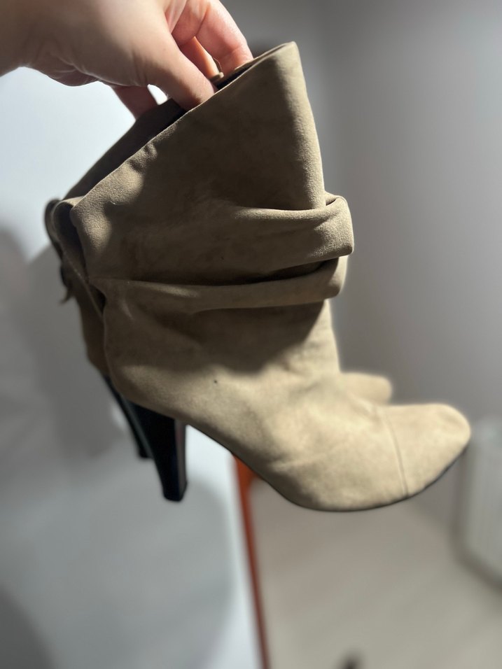 Bej süet kadın bot, stiletto topuklu ve tokalı detaylıdır. Desensiz, çağdaş tarzda, günlük kullanıma uygundur. Trendy casual Parisian stilini yansıtır.