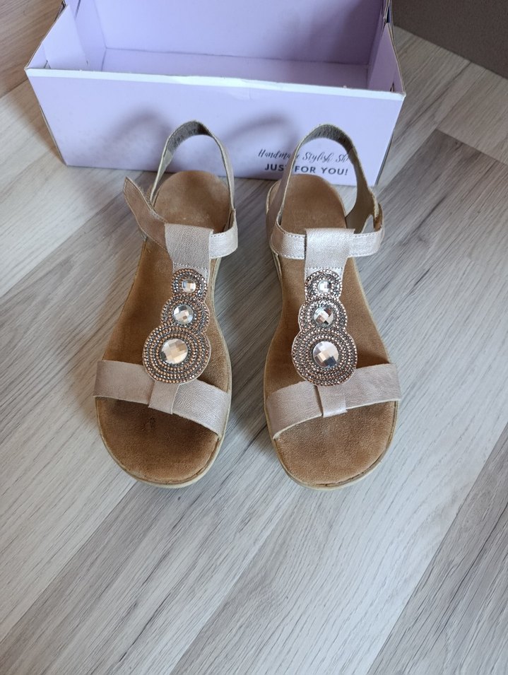 Bej süet malzemeden yapılmış, dolgu topuklu kadın sandalet. Bohem tarzında, tokalı ve baskılı desenlerle süslenmiş. Günlük kullanıma uygun, ORYOUI markalı.