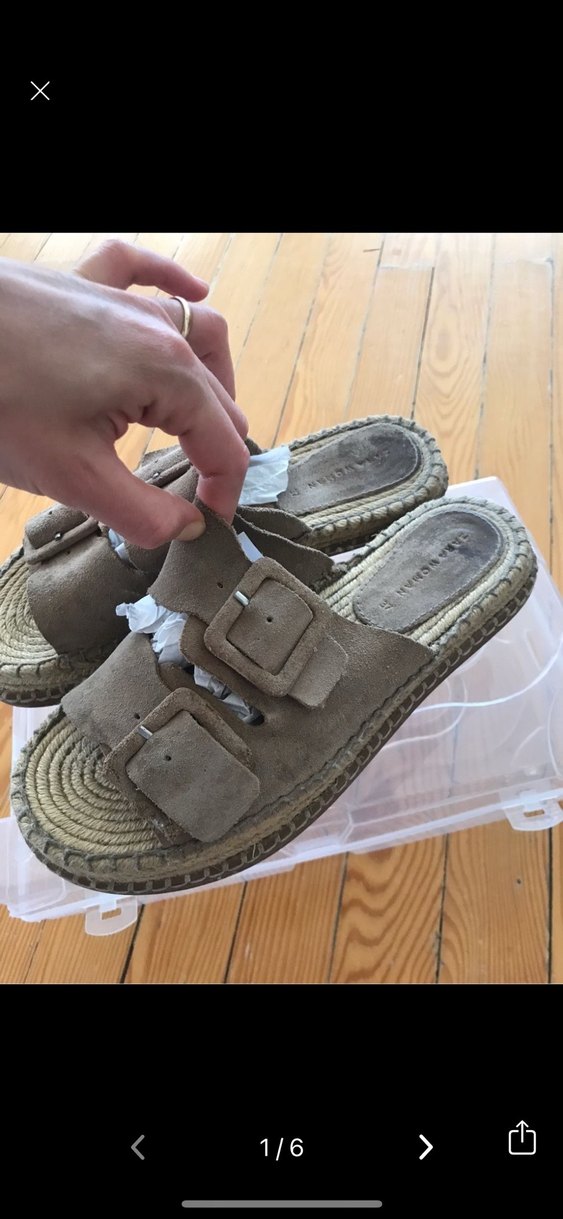 Bej süet malzemeden tokalı kayışlara ve dolgu topuklara sahip, bohem tarzda günlük kullanıma uygun rahat espadril.