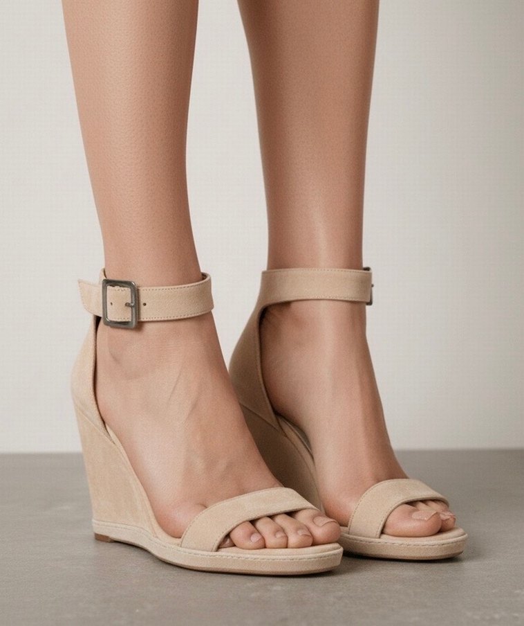 Bej süet malzemeden yapılmış, tokalı bilek kayışına sahip dolgu topuklu kadın ayakkabısıdır. Minimalist ve çağdaş tarzda, günlük kullanıma uygun pastel renklidir.