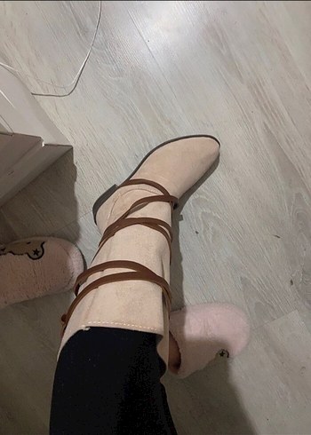 Bej süet malzemeden yapılmış, tokalı kayışlı rahat, bohem tarzda kadın botu. Günlük kullanıma uygun, açık renk ve desensiz.