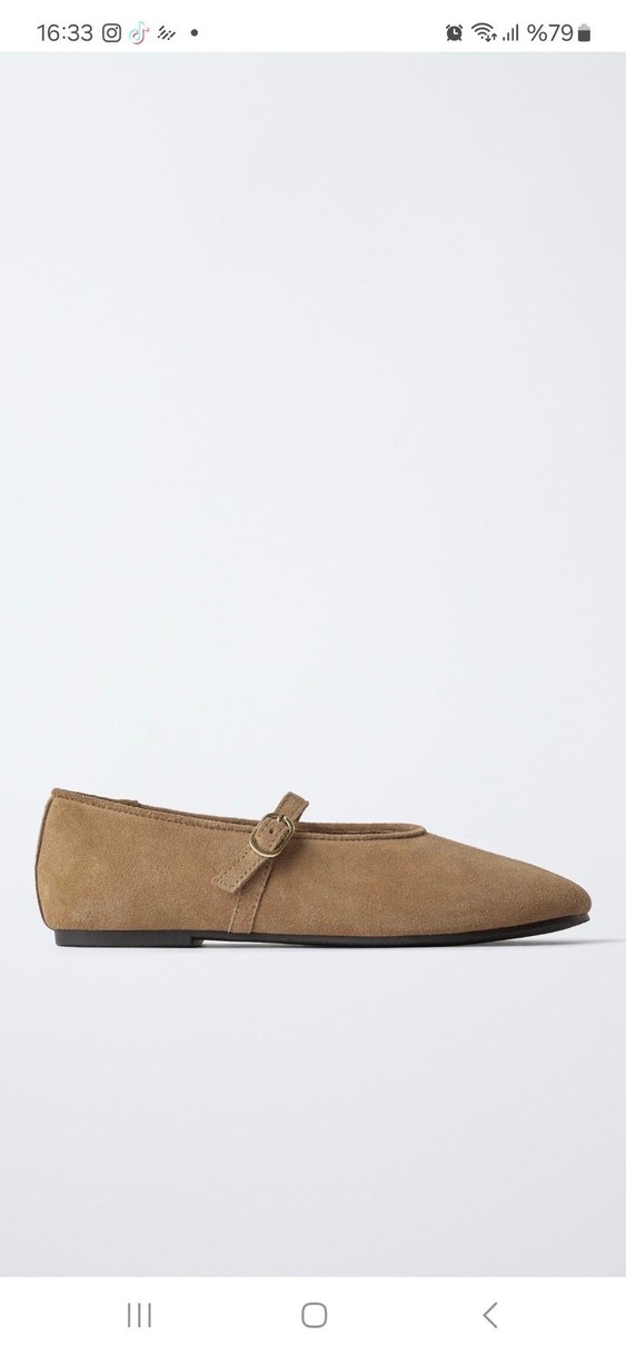 Bej süet malzemeden yapılmış, tokalı ve ince stiletto topuklu kadın babet. Minimalist ve zarif tasarım, günlük kullanıma uygun.
