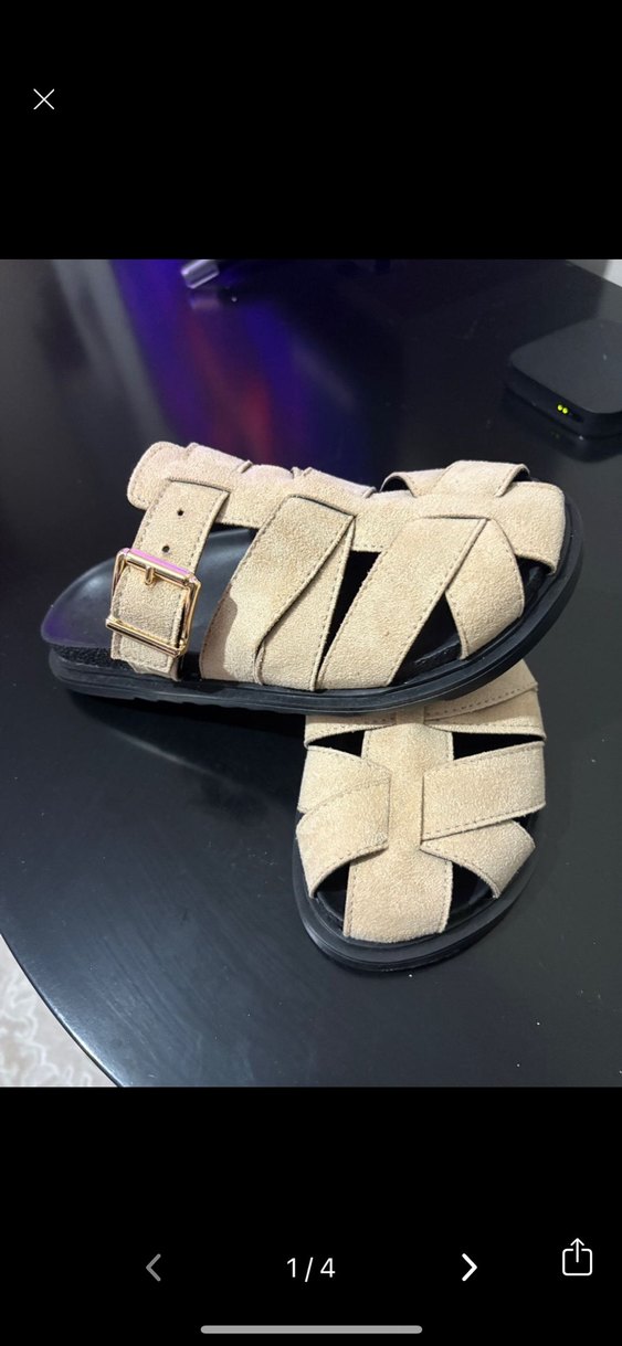 Bej süet malzemeden, tokalı kayışlı ve blok topuklu kadın sandalet. Minimalist, günlük kullanım için rahat ve şık tasarım.