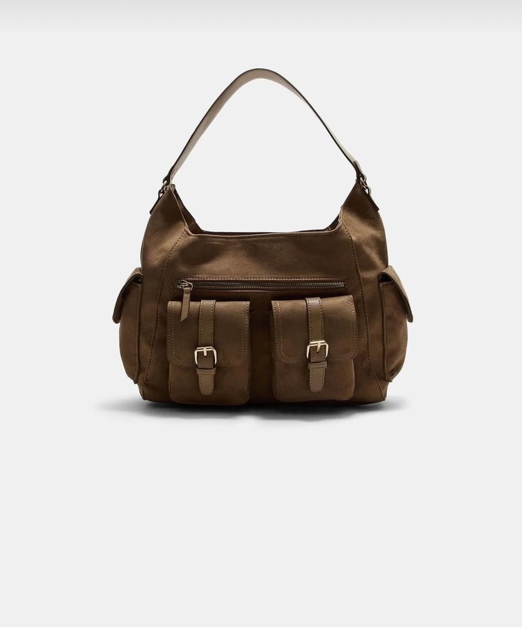 Bej süet materyalden yapılmış, tokalı ön cepleriyle minimalist, çağdaş tasarıma sahip kadın çantası. Günlük kullanıma uygundur. Etiketli hiç kullanılmadı