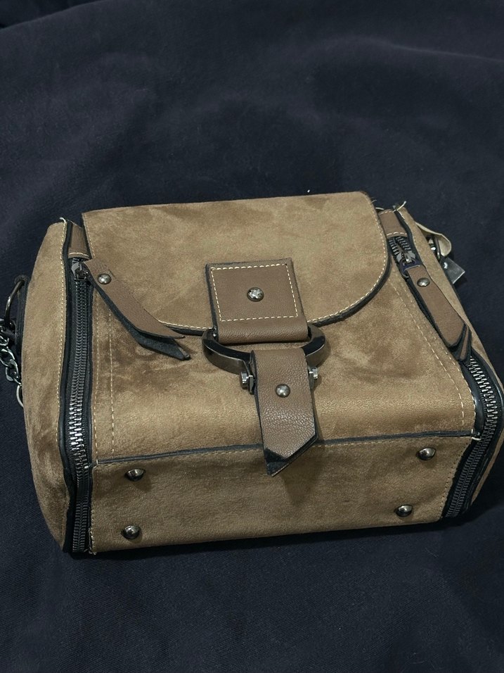 Bej süet kadın çanta, tokalı kapak ve fermuar detaylarına sahip. Vintage rock punk tarzını yansıtan düz yüzeyi ile günlük kullanıma uygundur.
