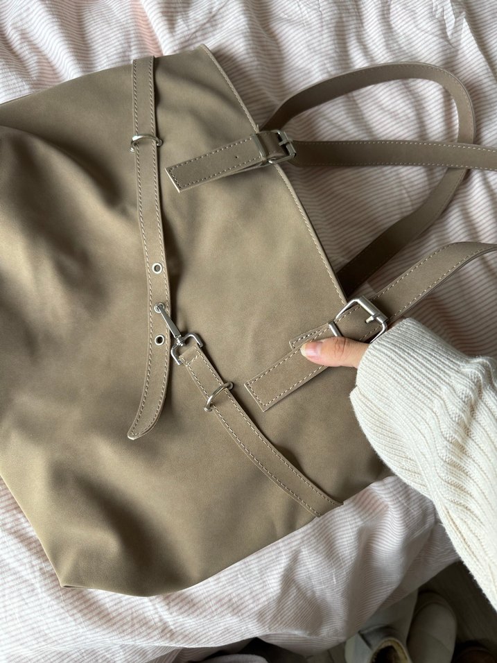 Bej süet malzemeden yapılmış, tokalı kayışlara sahip, desensiz ve minimalist tarzda kadın çantası, gündelik kullanıma uygundur.