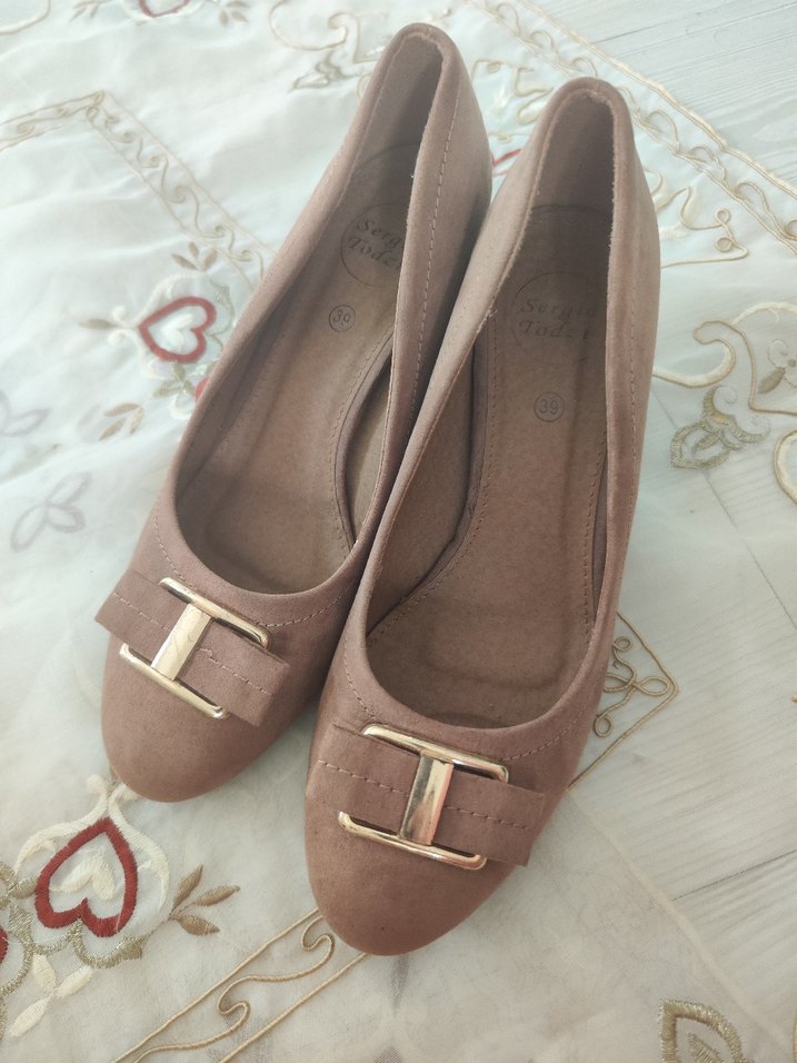 Bej süet malzemeden yapılmış, tokalı ve dolgu topuklu kadın babetleri, günlük kullanıma uygun klasik ve desensiz tasarım. sadece 2 defa giydim. .rahat kısa topuk ofis ortamına uygun .herşey ile kombin model topuk 6 cm Sergio todzi marka