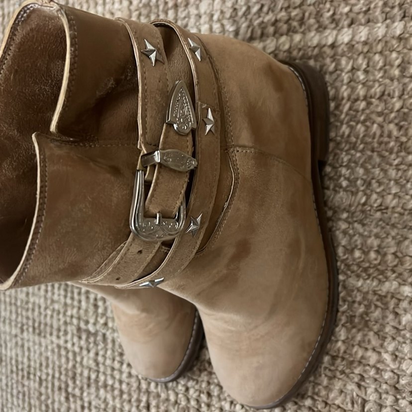 Bej süet kadın botları, tokalı kayış ve dolgu topuklu, günlük kullanım için rahat bohem tarz sunar.