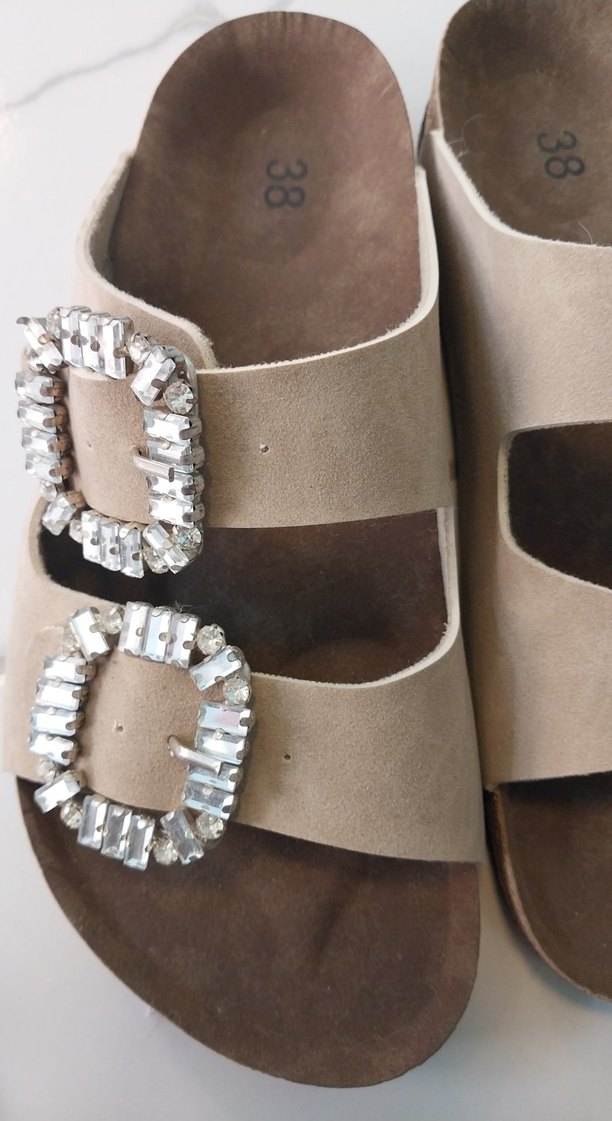 Bej süet, tokalı kadın dolgu topuk terlikler, nakış detaylı, romantik akşamlar için uygun.