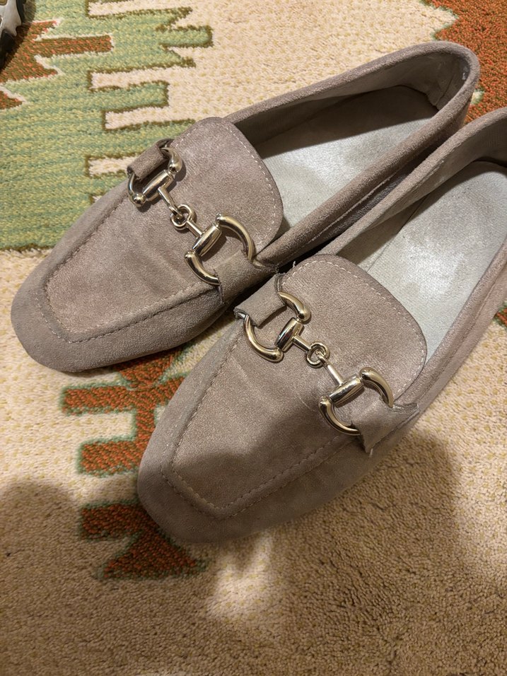Bej süet malzemeden, tokalı ve blok topuklu kadın loafer. Yılan derisi desenli, günlük kullanıma uygun bohem tarzda rahat ayakkabı.