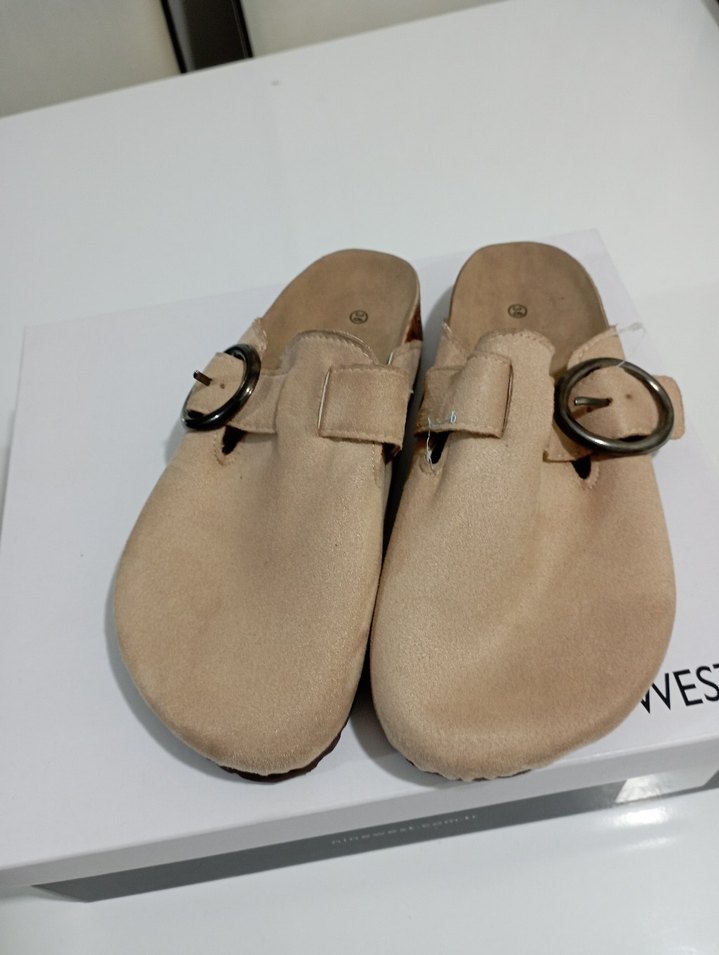 Bej süet malzemeden yapılmış, tokalı ve dolgu topuklu kadın terliği. Minimalist ve bohem tarzıyla gündelik kullanıma uygun.