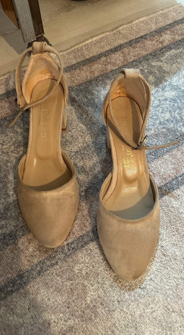 Bej süet malzemeden, tokalı ve blok topuklu kadın ayakkabısı, günlük kullanım için şık ve çağdaş bir tasarıma sahiptir.