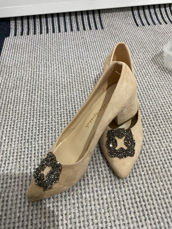 Bej süet malzemeden yapılmış, tokalı ve kalın topuklu kadın ayakkabısı. Modern klasik tarzda, düğün gibi özel günler için uygundur.