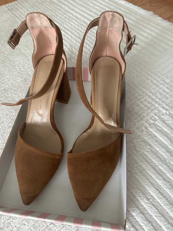 Bej süet, tokalı, blok topuklu kadın ayakkabısı. Hafif ve desensiz, romantik akşamlar için Paris tarzında şık bir model.