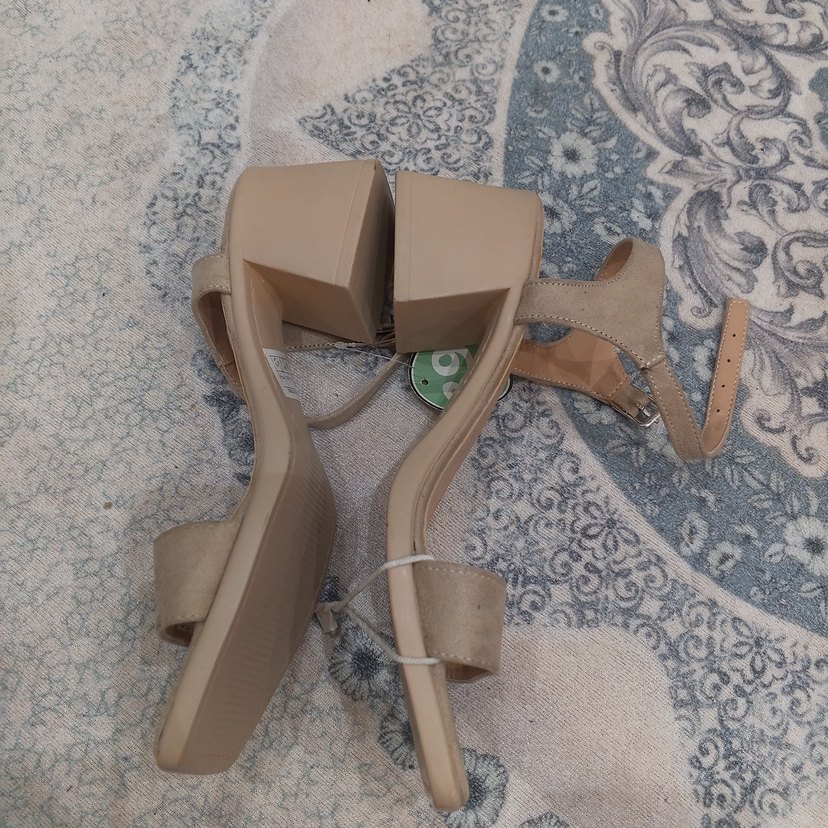 Bej süet kadın topuklu ayakkabılar, blok topuklu ve minimal ve bohem tarzı bir arada sunar.