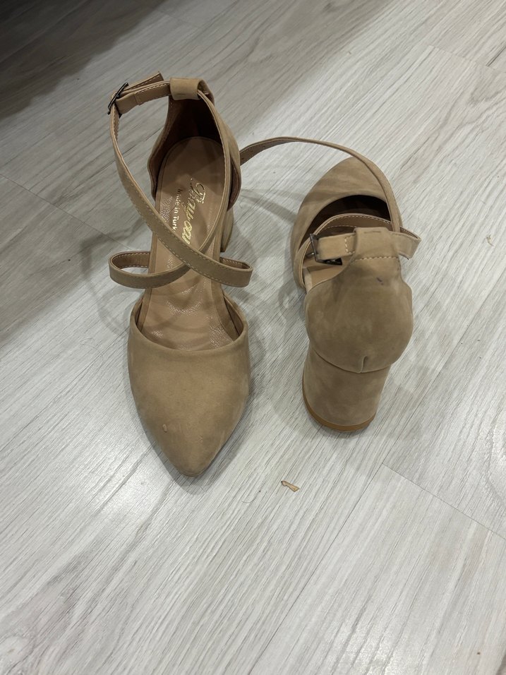 Bej süet malzemeden yapılmış, tokalı kayışlara ve blok topuğa sahip kadın ayakkabısı. Günlük kullanıma uygun, çağdaş ve desensiz tasarım.