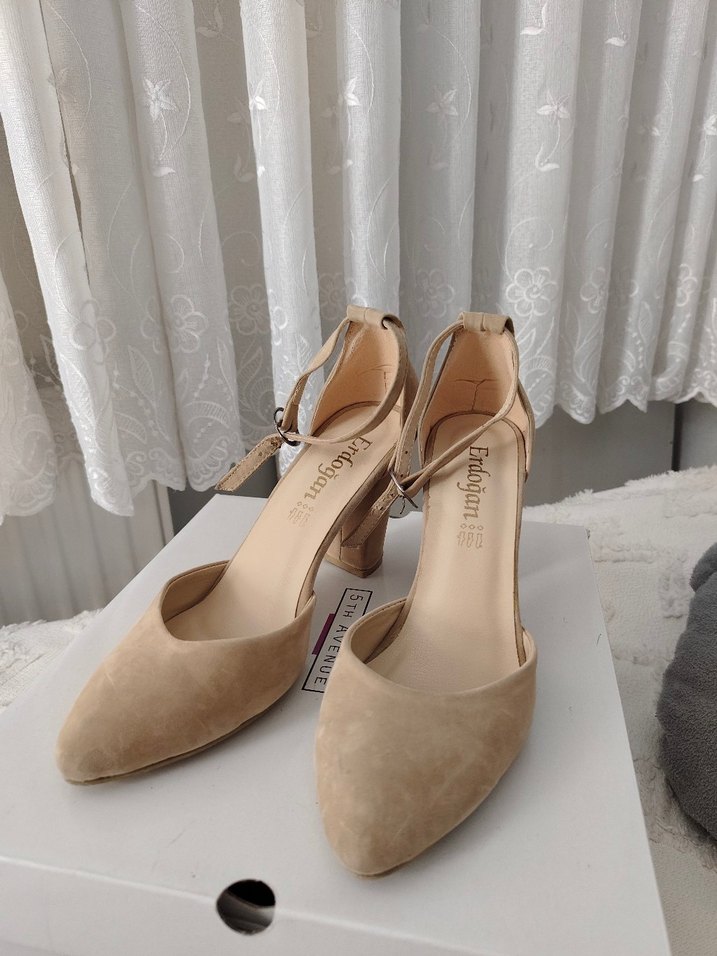 Bej süet malzemeden, tokalı kayış ve kalın topuklu, klasik ve çağdaş tarzda kadın abiye ayakkabı.