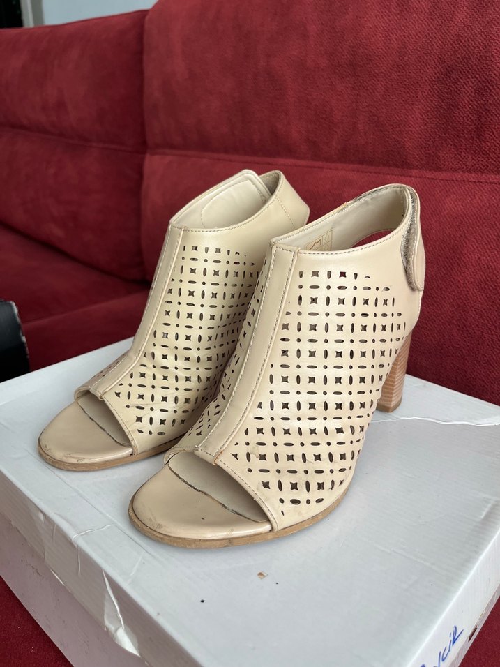 Bej süet kadın topuklu sandalet, tokalı ve açık burunlu, minimal delikli desenle günlük kullanıma uygun.