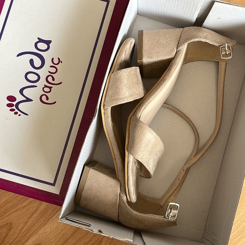 1 kez evde giyildi. Bej süet malzemeden, tokalı kayışlı, blok topuklu kadın sandalet. Günlük kullanıma uygun. FİYAT SONDUR. TEKLİF KABUL EDİLMEMEKTEDİR.