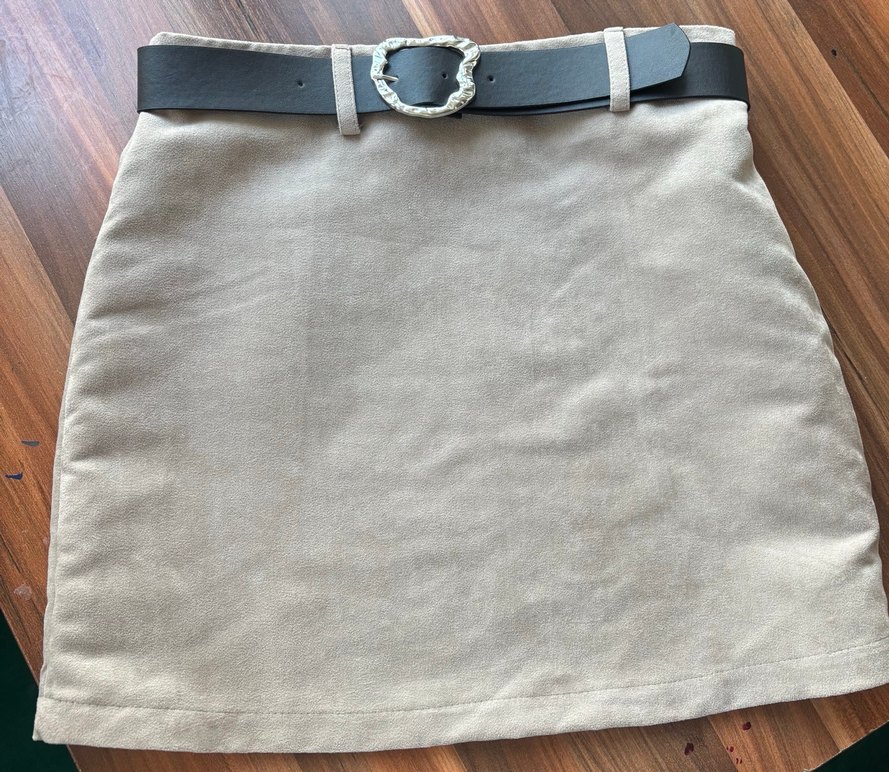 Bej süet midi etek, gri tokalı kemerle, bol kesim ve minimalist tarzda, günlük kullanım için uygun. S M L MEVCUTTUR