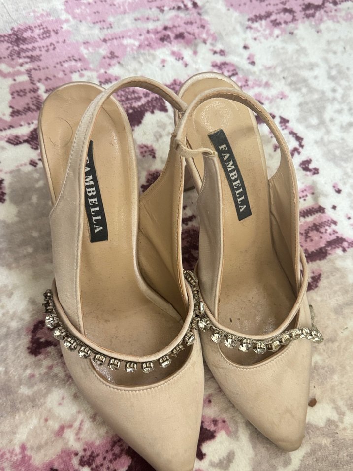 Bej süet malzemeden tokalı ve taş detaylı stiletto topuklu abiye ayakkabı. Mabella markalı, düğünler için şık bir seçim.