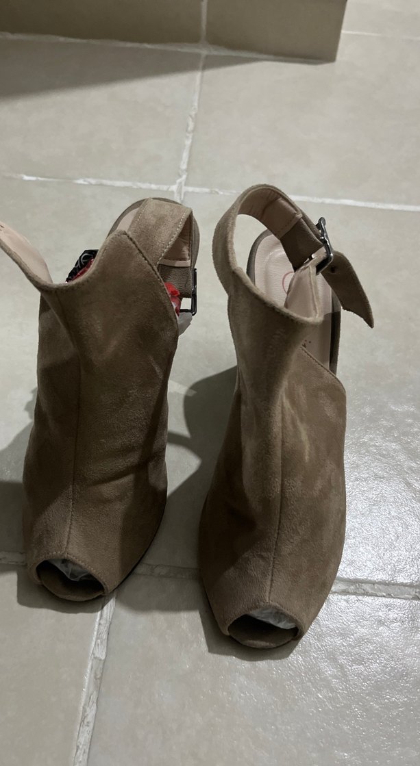 Bej süet tokalı, açık burunlu kadın stiletto ayakkabı, şık ve çağdaş tasarıma sahip. Günlük kullanıma uygundur.