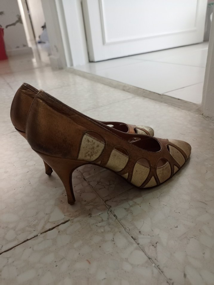 Bej süet malzemeden yapılmış, tokalı ve parlak yüzeye sahip vintage tarzda yüksek topuklu kadın ayakkabısıdır.