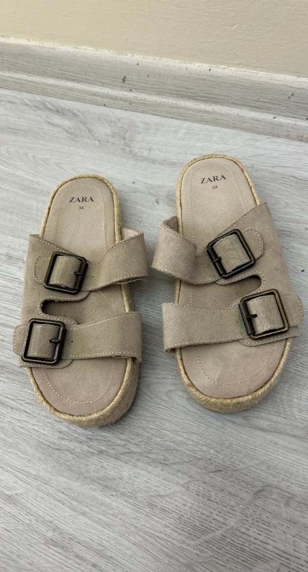 Bej süet kadın terlik, platform topuklu ve tokalı kayışlıdır. Zara'dan minimalist ve bohem tarzda, günlük kullanıma uygundur. Ürün birkaç kaç giyildi gayet iyi durumda.34 numara