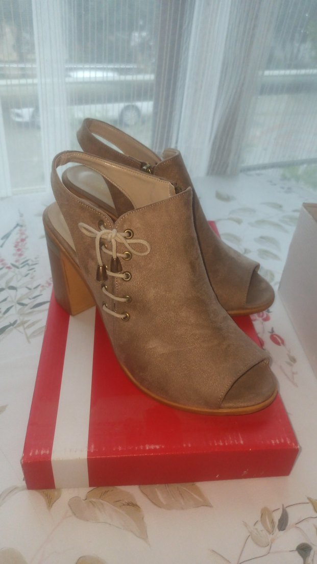 Bej süet malzemeden yapılmış, tokalı ve blok topuklu kadın ayakkabısı. Vintage bohem tarzıyla günlük kullanıma uygun, trend bir model.
