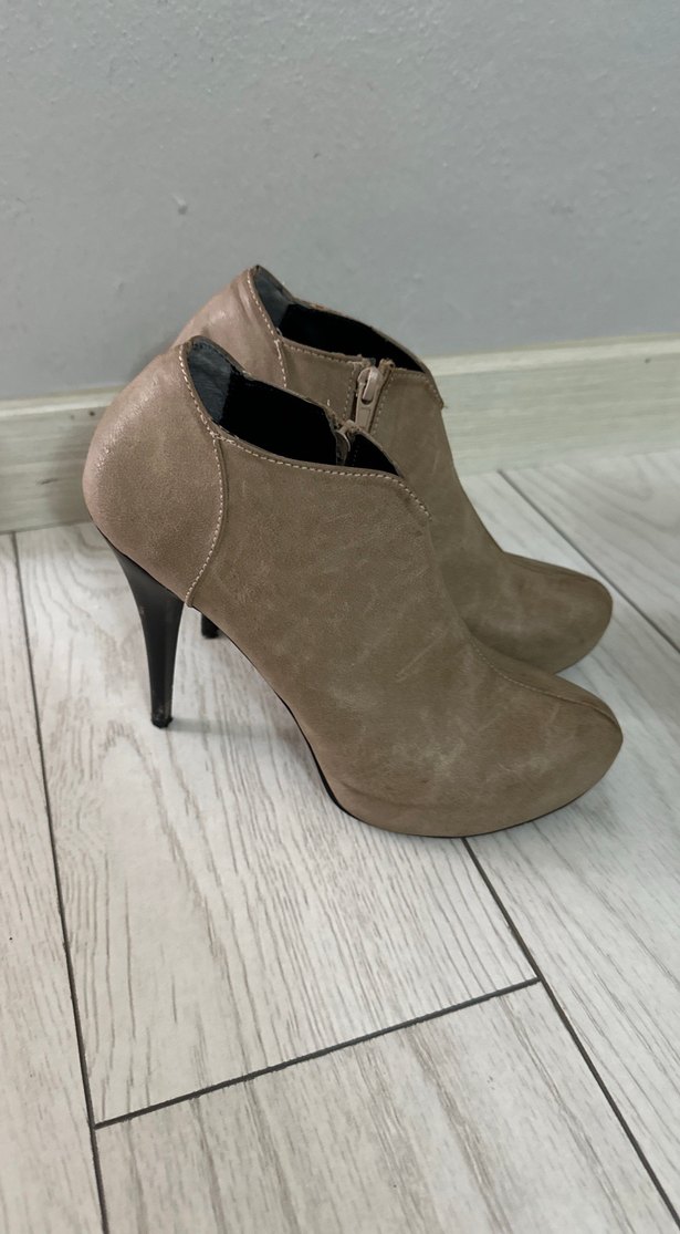Bej süet malzemeden yapılmış, stiletto topuklu ve yan fermuarlı kadın botu, çağdaş Paris tarzında günlük kullanım için uygundur.