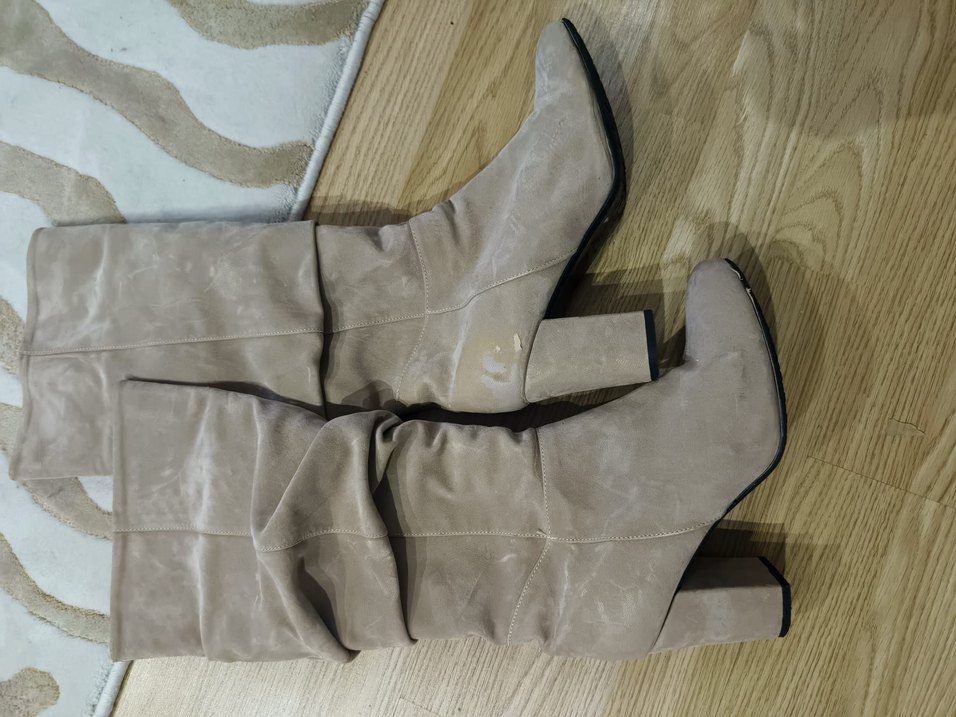 Bej süet diz boyu çizmeler, stiletto topuklu ve tokalı detaylıdır. Rahat ve bohem tarzı bir araya getirir, günlük kullanıma uygundur. ufak defosu var son fotoya ekledim fiyata yansittim