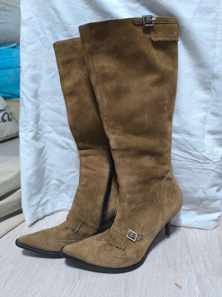 Bej süet diz boyu çizme, ince topuklu ve tokalı detaylara sahip, günlük kullanıma uygun rahat bohem tarzda. Millans 39 numara