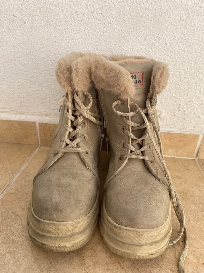 Bej süet malzemeden yapılmış, tüy detaylı dolgu topuk kadın botu, rahat ve trend günlük kullanım için uygundur.