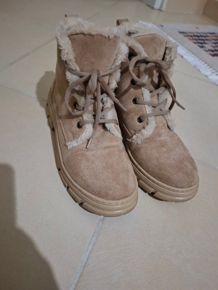 Bej süet malzemeden yapılmış, tüylü detaylı ve dolgu topuklu kadın botları, gündelik sokak tarzı için uygun.