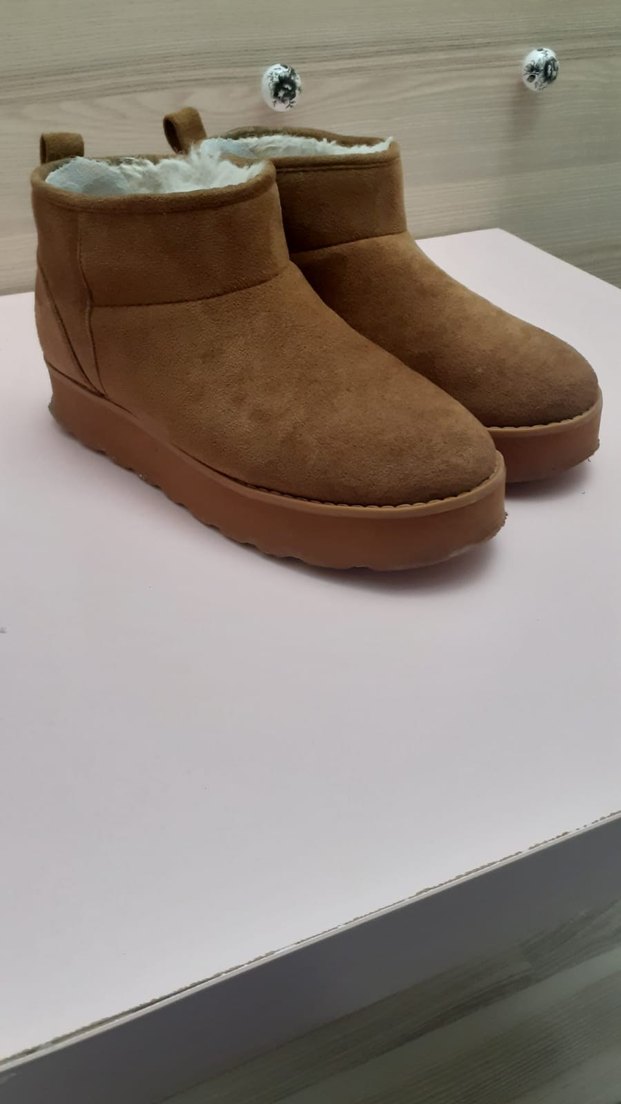Bej süet malzemeden yapılmış, içi tüylü ve dolgu topuklu kadın botları. Rahat ve sıcak tutan, gündelik kullanıma uygun tarzda.