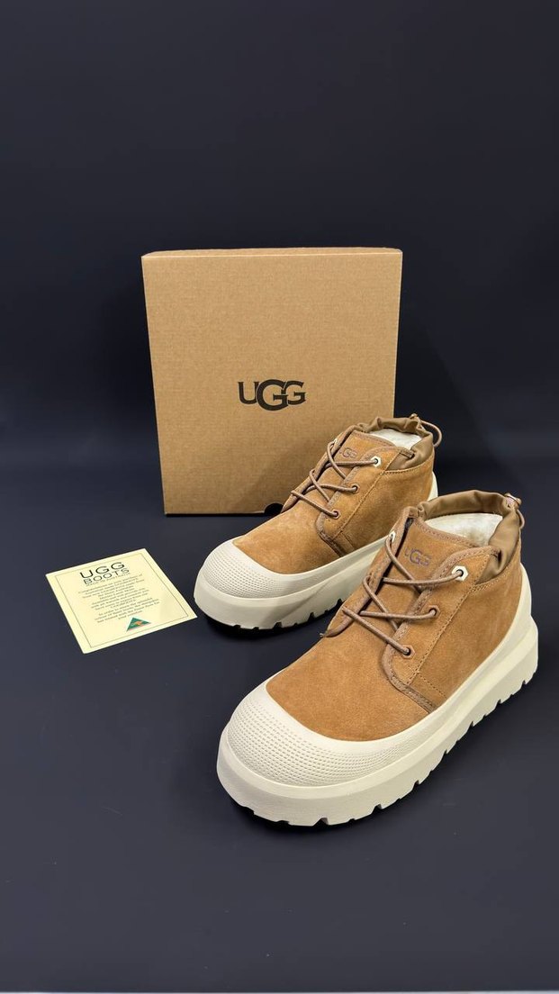 Bej süet UGG erkek botları, dolgu topuklu ve rahat iç astarlı, desen içermeyen sade tasarımıyla şık ve rahat bir sokak stili sunar.