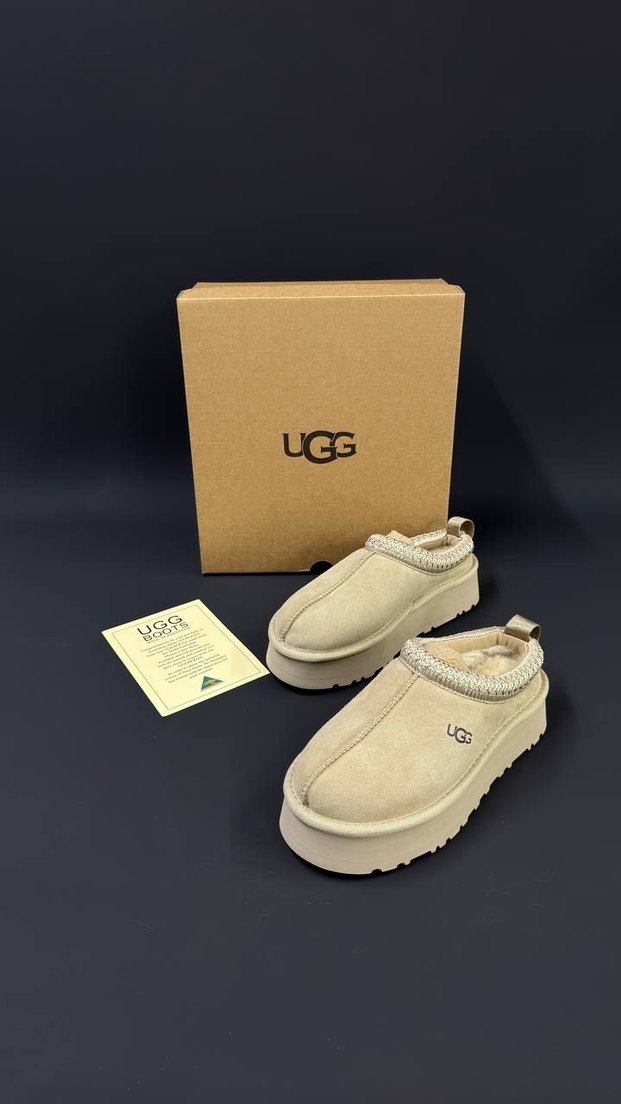 Bej süet UGG kadın terlikleri, platform topuklu, rahat ve şık tasarımıyla günlük kullanım için uygundur. Sokak modasına uyum sağlar.
