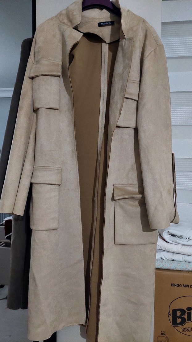 Bej renkli, süet kumaştan, uzun boy ve kemerli kadın trençkotu. Notch yaka ve askılı kollu, rahat kesim ile sokak modasına uygun. Günlük kullanıma uygundur.