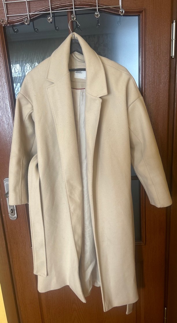 Bej renkte, süet kumaştan uzun kaban. Yakası kesik, uzun kollu ve rahat kesimlidir, minimalist ve şık tarz sunar. Biraz tüylenmeler mevcut s-m olur